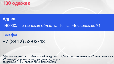 100 одежек по адресу 440000, Пензенская область, Пенза, Московская, 91 в дальнейшем Организация, размещена в следующих категориях: