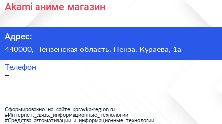Akami, аниме-магазин по адресу 440000, Пензенская область, Пенза, Кураева, 1а в дальнейшем Организация, размещена в следующих категориях: