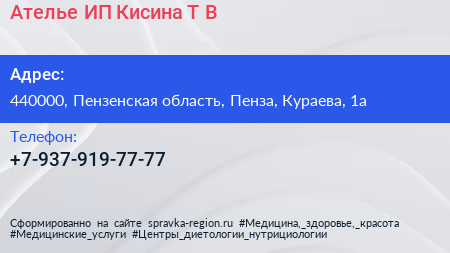 Ателье, ИП Кисина Т.В. по адресу 440000, Пензенская область, Пенза, Кураева, 1а в дальнейшем Организация, размещена в следующих категориях: