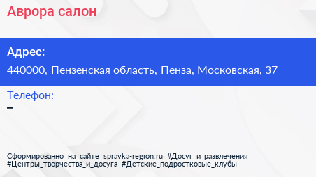 Аврора, салон по адресу 440000, Пензенская область, Пенза, Московская, 37 в дальнейшем Организация, размещена в следующих категориях: