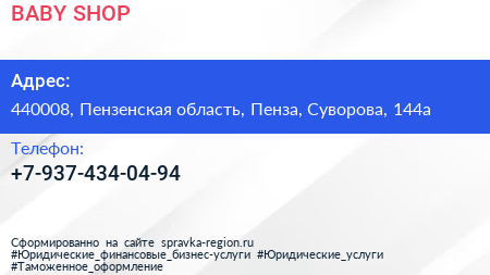 BABY SHOP по адресу 440008, Пензенская область, Пенза, Суворова, 144а в дальнейшем Организация, размещена в следующих категориях: