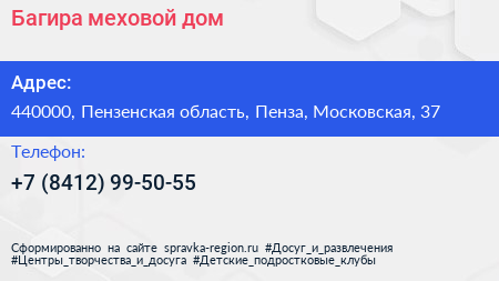 Багира, меховой дом по адресу 440000, Пензенская область, Пенза, Московская, 37 в дальнейшем Организация, размещена в следующих категориях: