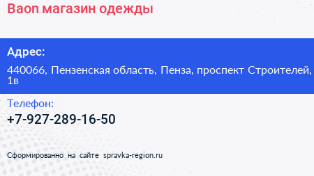 Baon, магазин одежды по адресу 440066, Пензенская область, Пенза, проспект Строителей, 1в в дальнейшем Организация, размещена в следующих категориях: