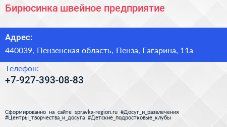 Бирюсинка, швейное предприятие по адресу 440039, Пензенская область, Пенза, Гагарина, 11а в дальнейшем Организация, размещена в следующих категориях: