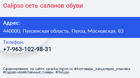 Calipso, сеть салонов обуви по адресу 440000, Пензенская область, Пенза, Московская, 83 в дальнейшем Организация, размещена в следующих категориях:
