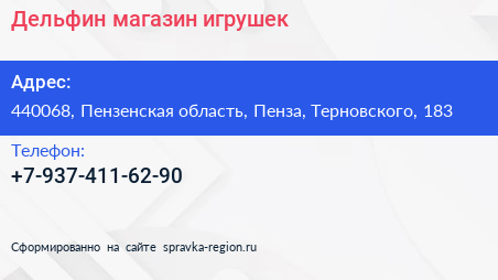 Дельфин, магазин игрушек по адресу 440068, Пензенская область, Пенза, Терновского, 183 в дальнейшем Организация, размещена в следующих категориях: