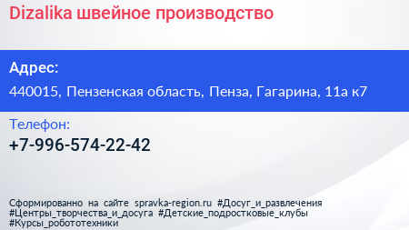 Dizalika, швейное производство по адресу 440015, Пензенская область, Пенза, Гагарина, 11а к7 в дальнейшем Организация, размещена в следующих категориях: