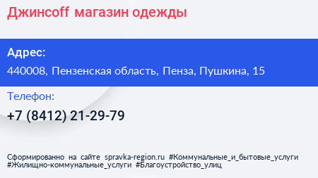 Джинсоff, магазин одежды по адресу 440008, Пензенская область, Пенза, Пушкина, 15 в дальнейшем Организация, размещена в следующих категориях: