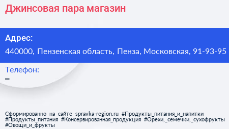 Джинсовая пара, магазин по адресу 440000, Пензенская область, Пенза, Московская, 91-93-95 в дальнейшем Организация, размещена в следующих категориях: