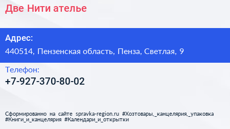 Две Нити, ателье по адресу 440514, Пензенская область, Пенза, Светлая, 9 в дальнейшем Организация, размещена в следующих категориях: