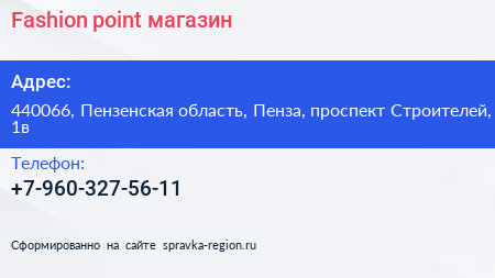 Fashion point, магазин по адресу 440066, Пензенская область, Пенза, проспект Строителей, 1в в дальнейшем Организация, размещена в следующих категориях: