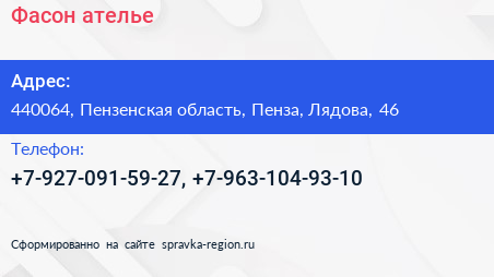 Фасон, ателье по адресу 440064, Пензенская область, Пенза, Лядова, 46 в дальнейшем Организация, размещена в следующих категориях: