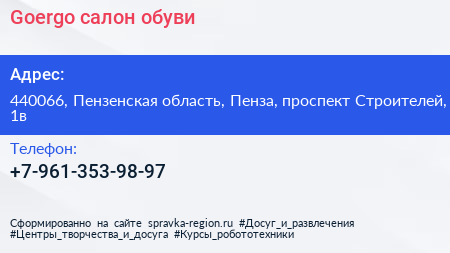 Goergo, салон обуви по адресу 440066, Пензенская область, Пенза, проспект Строителей, 1в в дальнейшем Организация, размещена в следующих категориях: