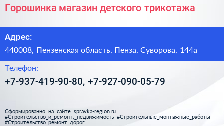 Горошинка, магазин детского трикотажа по адресу 440008, Пензенская область, Пенза, Суворова, 144а в дальнейшем Организация, размещена в следующих категориях: