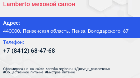 Lamberto, меховой салон по адресу 440000, Пензенская область, Пенза, Володарского, 67 в дальнейшем Организация, размещена в следующих категориях: