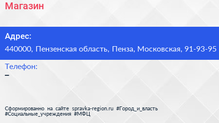 Магазин по адресу 440000, Пензенская область, Пенза, Московская, 91-93-95 в дальнейшем Организация, размещена в следующих категориях: