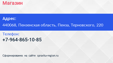 Магазин по адресу 440068, Пензенская область, Пенза, Терновского, 220 в дальнейшем Организация, размещена в следующих категориях: