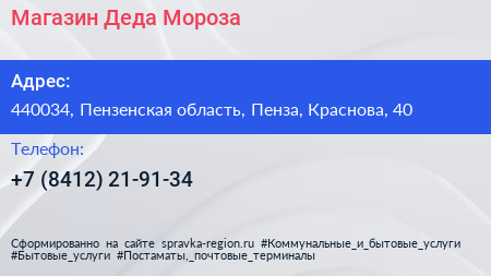 Магазин Деда Мороза по адресу 440034, Пензенская область, Пенза, Краснова, 40 в дальнейшем Организация, размещена в следующих категориях: