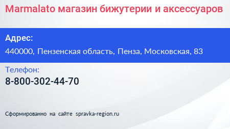 Marmalato, магазин бижутерии и аксессуаров по адресу 440000, Пензенская область, Пенза, Московская, 83 в дальнейшем Организация, размещена в следующих категориях: