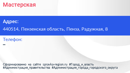 Мастерская по адресу 440514, Пензенская область, Пенза, Радужная, 8 в дальнейшем Организация, размещена в следующих категориях:
