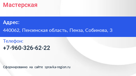 Мастерская по адресу 440062, Пензенская область, Пенза, Собинова, 3 в дальнейшем Организация, размещена в следующих категориях:
