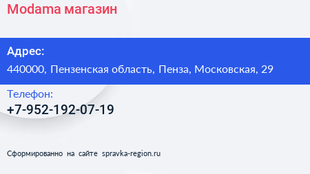 Modama, магазин по адресу 440000, Пензенская область, Пенза, Московская, 29 в дальнейшем Организация, размещена в следующих категориях: