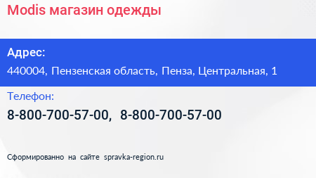 Modis, магазин одежды по адресу 440004, Пензенская область, Пенза, Центральная, 1 в дальнейшем Организация, размещена в следующих категориях: