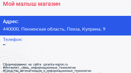 Мой малыш, магазин по адресу 440000, Пензенская область, Пенза, Куприна, 9 в дальнейшем Организация, размещена в следующих категориях: