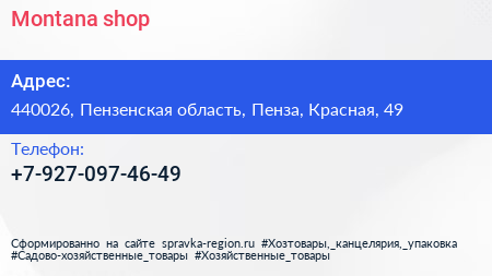Montana shop по адресу 440026, Пензенская область, Пенза, Красная, 49 в дальнейшем Организация, размещена в следующих категориях:
