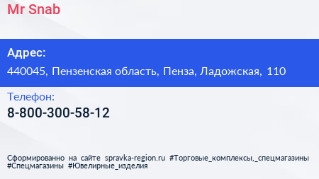 Mr.Snab по адресу 440045, Пензенская область, Пенза, Ладожская, 110 в дальнейшем Организация, размещена в следующих категориях: