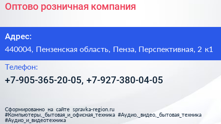 Оптово-розничная компания по адресу 440004, Пензенская область, Пенза, Перспективная, 2 к1 в дальнейшем Организация, размещена в следующих категориях:
