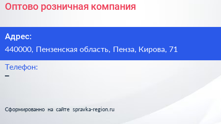 Оптово-розничная компания по адресу 440000, Пензенская область, Пенза, Кирова, 71 в дальнейшем Организация, размещена в следующих категориях: