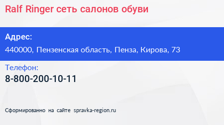 Ralf Ringer, сеть салонов обуви по адресу 440000, Пензенская область, Пенза, Кирова, 73 в дальнейшем Организация, размещена в следующих категориях: