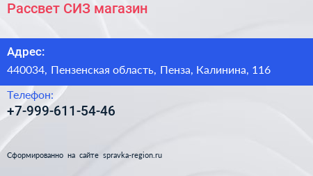 Рассвет СИЗ, магазин по адресу 440034, Пензенская область, Пенза, Калинина, 116 в дальнейшем Организация, размещена в следующих категориях: