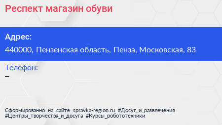 Респект, магазин обуви по адресу 440000, Пензенская область, Пенза, Московская, 83 в дальнейшем Организация, размещена в следующих категориях: