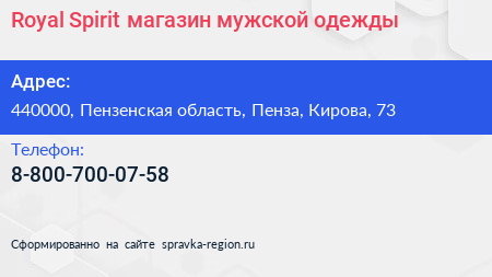 Royal Spirit, магазин мужской одежды по адресу 440000, Пензенская область, Пенза, Кирова, 73 в дальнейшем Организация, размещена в следующих категориях: