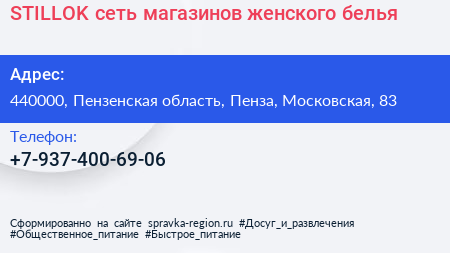 STILLOK, сеть магазинов женского белья по адресу 440000, Пензенская область, Пенза, Московская, 83 в дальнейшем Организация, размещена в следующих категориях: