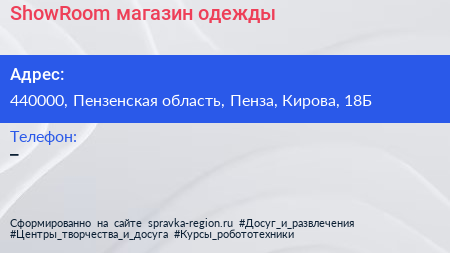 ShowRoom, магазин одежды по адресу 440000, Пензенская область, Пенза, Кирова, 18Б в дальнейшем Организация, размещена в следующих категориях: