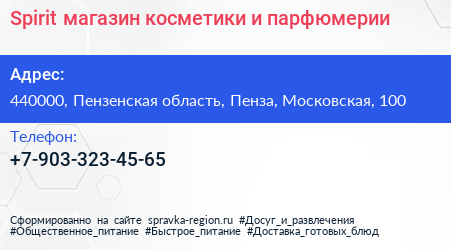 Spirit, магазин косметики и парфюмерии по адресу 440000, Пензенская область, Пенза, Московская, 100 в дальнейшем Организация, размещена в следующих категориях:
