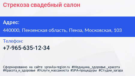 Стрекоза, свадебный салон по адресу 440000, Пензенская область, Пенза, Московская, 103 в дальнейшем Организация, размещена в следующих категориях: