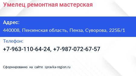 Умелец, ремонтная мастерская по адресу 440008, Пензенская область, Пенза, Суворова, 225Б/1 в дальнейшем Организация, размещена в следующих категориях: