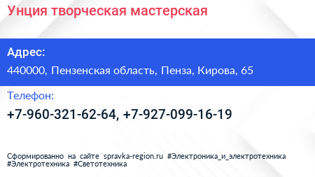 Унция, творческая мастерская по адресу 440000, Пензенская область, Пенза, Кирова, 65 в дальнейшем Организация, размещена в следующих категориях: