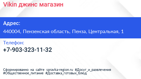 Vikin джинс, магазин по адресу 440004, Пензенская область, Пенза, Центральная, 1 в дальнейшем Организация, размещена в следующих категориях: