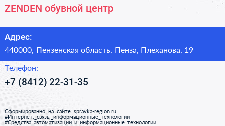 ZENDEN, обувной центр по адресу 440000, Пензенская область, Пенза, Плеханова, 19 в дальнейшем Организация, размещена в следующих категориях: