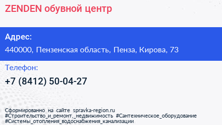 ZENDEN, обувной центр по адресу 440000, Пензенская область, Пенза, Кирова, 73 в дальнейшем Организация, размещена в следующих категориях: