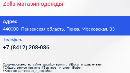 Zolla, магазин одежды по адресу 440000, Пензенская область, Пенза, Московская, 83 в дальнейшем Организация, размещена в следующих категориях: