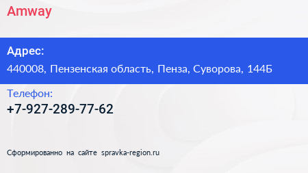Amway по адресу 440008, Пензенская область, Пенза, Суворова, 144Б в дальнейшем Организация, размещена в следующих категориях: