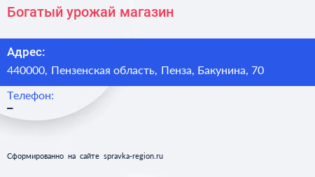 Богатый урожай, магазин по адресу 440000, Пензенская область, Пенза, Бакунина, 70 в дальнейшем Организация, размещена в следующих категориях:
