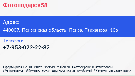 Фотоподарок58 по адресу 440007, Пензенская область, Пенза, Тарханова, 10в в дальнейшем Организация, размещена в следующих категориях: