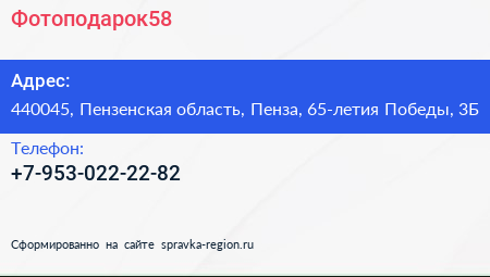 Фотоподарок58 по адресу 440045, Пензенская область, Пенза, 65-летия Победы, 3Б в дальнейшем Организация, размещена в следующих категориях: